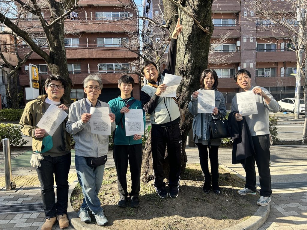 さらに植え替えの後は、地域のボランティアの方々の力を借りて、かむろ坂さくらまつりの事前通知のお便りをポスティングしました。3月29日はかむろ坂に交通規制をかけるため、事前のお知らせをいたしました。